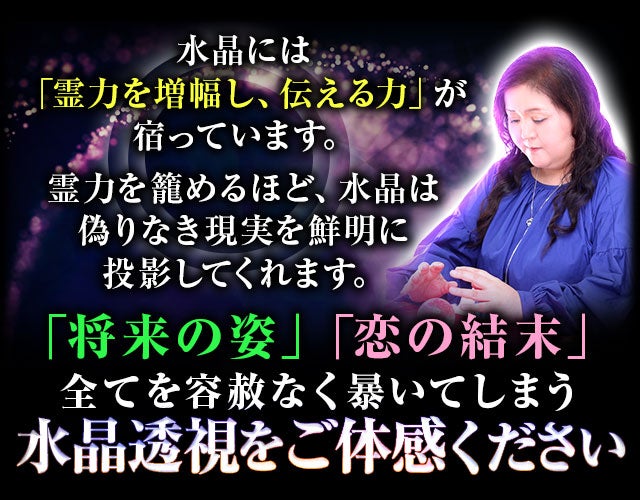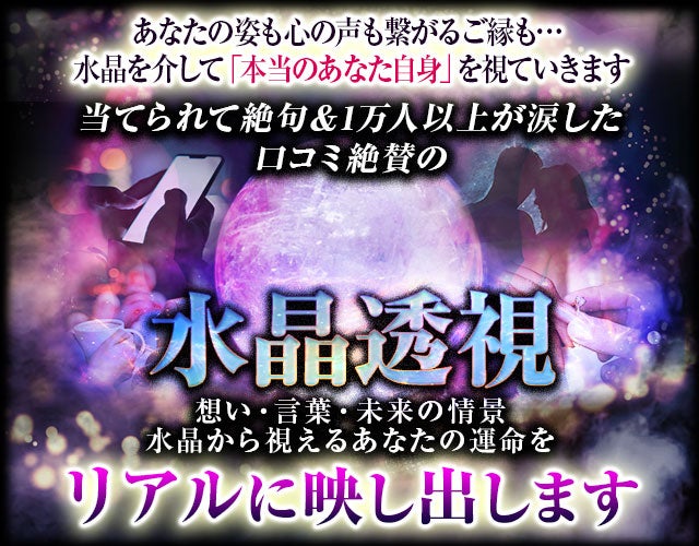 水晶から伝わってくるのは、あなたの今の状況、周囲を取り巻く状況、そしてまだお気づきでない出来事…あなたの運命に深く関わる「事実」をお聞きください。