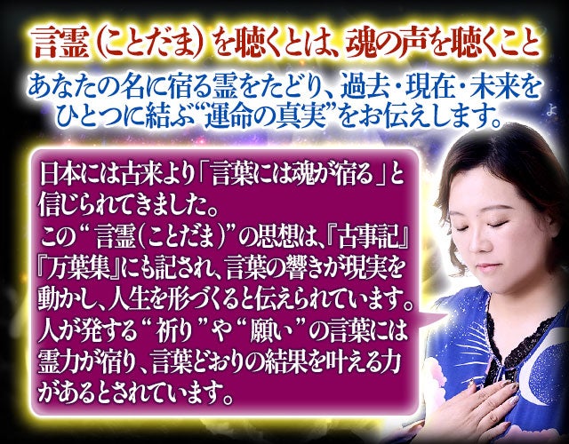 心の中に眠る言霊を霊視し、本当の願望や心の声を読み解きます。