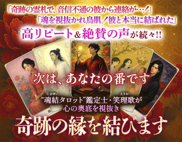 ただ結果を占うだけではありません。 魂がいま何を求め、どう繋がりたいと願っているのか――。その深層にある真実を読み解き、かけがえのないご縁をしっかりと結び直すためのメッセージを、どうぞお受け取りください。