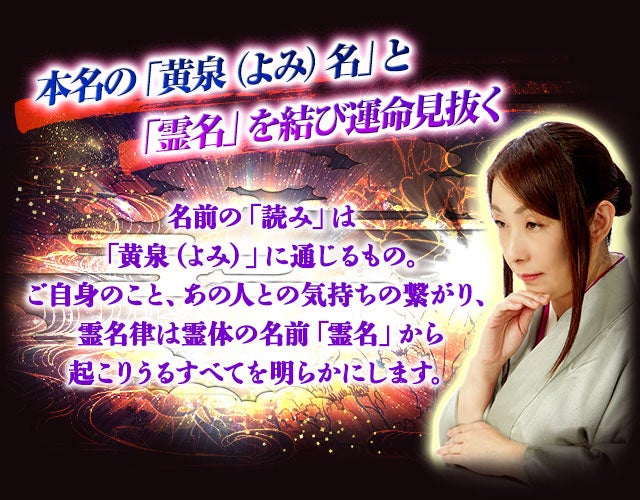 読み名は「黄泉(よみ)名」に通じるもの……名前と同じ音律を持つ「霊名」からあなたの宿命、あの人との絆を明らかにいたします。