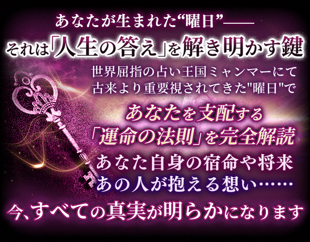 ミャンマー曜では通常の七曜日に水曜日の午後の時間、ヤフーと呼ばれる8個目の曜日を加えた八曜日で生まれ曜日を決定し、生まれた曜日によってその人の「本質」「愛」「人との相性」「運命」「隠された本性」などあらゆることを占うことができます。生活と密接に関わる“曜日”を解き明かし、運命を支配する法則を明らかにします。