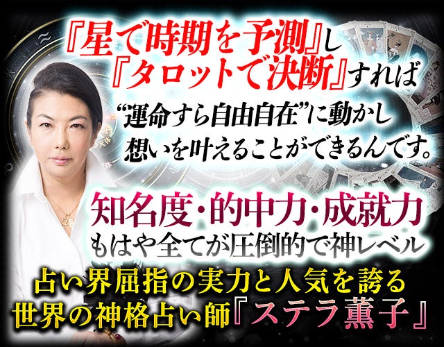“細密西洋占星術+フルデッキタロット”で知るあなたの人生と恋の全て。『星で時期を予測』し『タロットで決断』すれば運命すら自由自在に動かし想いを叶えることができます。驚くほど具体的で超精細。ステラ薫子にしかできない本物の鑑定をご体感下さい。