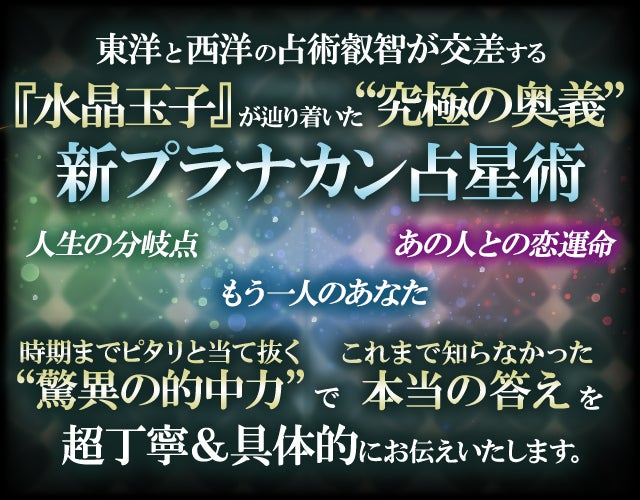 「東洋の暦」と「西洋の星」の技術を掛け合わせた、水晶玉子のオリジナル占術です。特別な暦と星のサイクルによって導き出される「プラナカンサイン」を紐解いていき、あなたの悩みや運命について詳細に解き明かします。