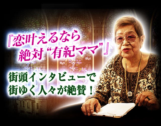 占歴60年以上を誇り、人生の酸いも甘いも噛み分けた鬼当て占い師「有紀」。新橋で“有紀ママ”として親しまれ、これまで数万人の相談者の恋愛・結婚・人生・仕事における多様で複雑な悩みを解決し、幸せへと導いてきた『本物の実力』をご体感下さい。